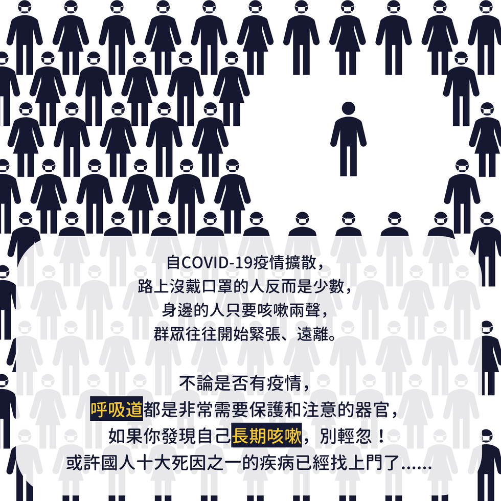 自從COVID-19(嚴重特殊傳染性肺炎)疫情擴散、衝擊全球以來,現在走在路上沒戴口罩的人反而是少數;搭乘大眾運輸工具時,身邊的人只要咳嗽兩聲,群眾總是開始緊張,想要離開那個咳嗽的人。其實不管有沒有肺炎流行,呼吸道都是非常需要保護和注意的。如果你發現自己長期咳嗽,可別輕忽這個症狀,因為也許國人十大死因當中的慢性阻塞肺疾病已經悄悄的找上門了。本篇文章就要帶大家了解這個隱形殺手的成因、診斷和照護方式。