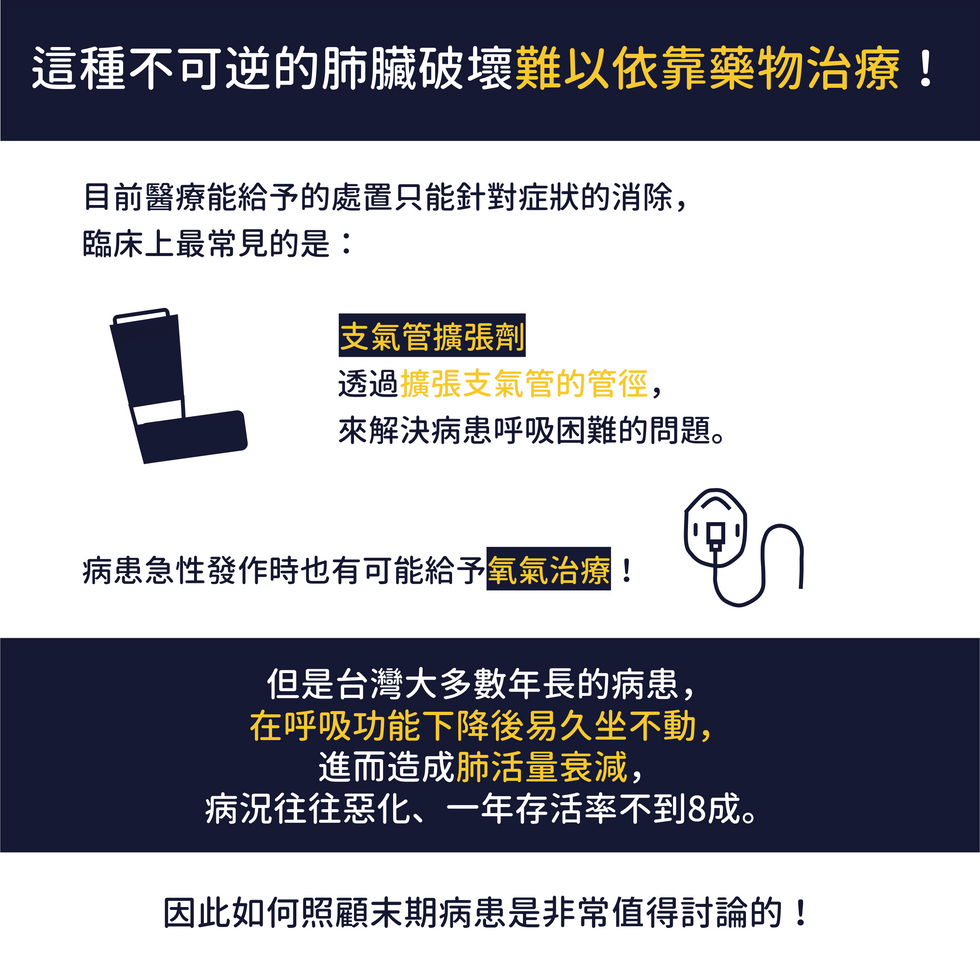 對於慢性阻塞肺疾病的病患來說,這種不可逆的肺臟破壞無法依靠藥物治療,目前醫療能給予的處置也僅是針對症狀處理。臨床上最常見的藥物是支氣管擴張劑,透過擴張支氣管來解決病患呼吸困難的問題,病患急性發作時也可能給予氧氣或是類固醇消除發炎反應。不過台灣大多數年長的病患在呼吸功能下降以後就容易久坐不動,進而造成肺活量衰減,所以病況惡化是在所難免,一年存活率也不到8成。在最後這段難以喘氣,連呼吸都很痛苦的時期如何照護病患是臨床上非常值得討論的。目前衛服部的臨床指引指出COPD患者在一般生活中應該接受呼吸訓練、營養支持等措施,讓肺功能惡化的速率盡可能降到最低,平時也要避免接觸各種危險因子,如二手煙、空氣汙染等。或許這種疾病不是現代醫學能夠治癒的,但是可以透過了解病因,盡可能擬訂妥善的照護計畫,最大限度的讓COPD病人不被疾病所困擾。