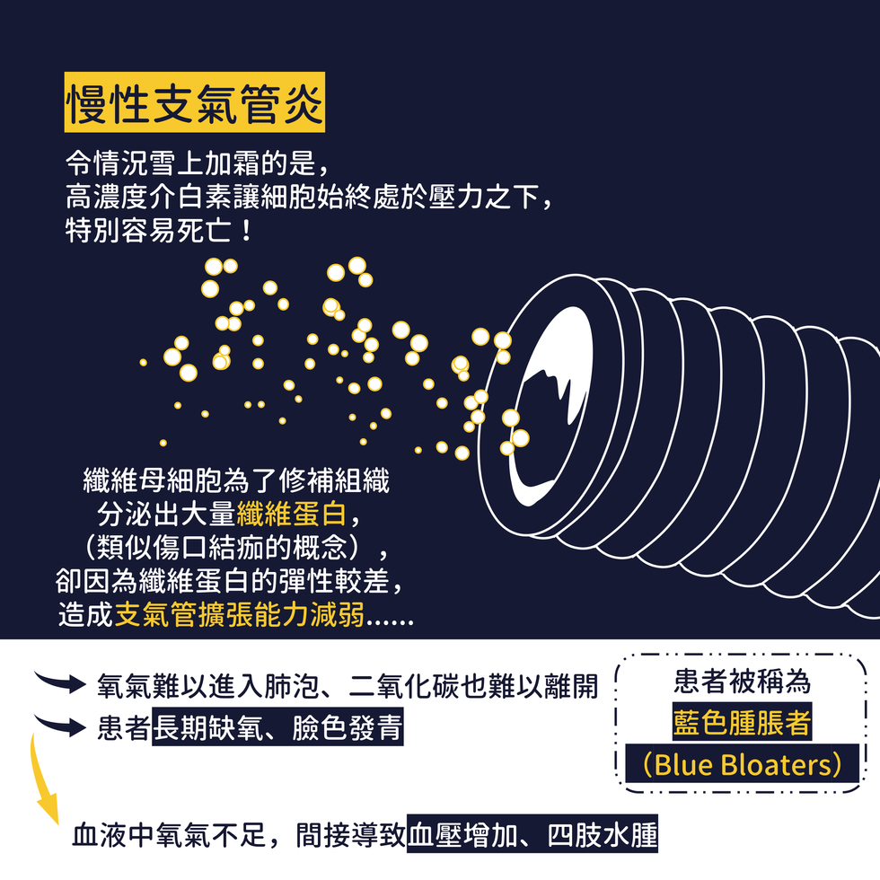 慢性阻塞肺疾病的成因其實和先前文章提過的原理相似[註1],可以概略地歸納成免疫系統活化時正常組織被「流彈」波及的結果。若器官長期處於發炎狀態中,則促進發炎的高濃度介白素(Interleukin)等物質不僅會啟動免疫反應,也會促使內皮中的杯狀細胞(Goblet cells)分泌大量黏液(Mucus)。這個機制原本是良好的物理屏障,但當黏液大量分泌、堆積在管壁上時,反而造成支氣管管徑變小[1]。令情況雪上加霜的是,高濃度的介白素讓細胞始終處於壓力之下,特別容易死亡。此時,纖維母細胞為了修補組織而分泌出大量的纖維蛋白(類似傷口結痂的概念)。然而纖維蛋白的彈性較差,最後造成支氣管擴張能力減弱。因此,氧氣難以進入肺泡,二氧化碳也難以離開,造成患者長期缺氧,臉色發青,更因為血液中氧氣量不足,間接導致血壓增加,四肢水腫,因此患者被稱為「藍色腫脹者」(Blue Bloaters)。
