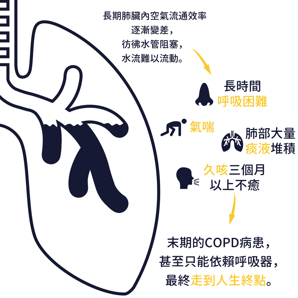 顧名思義,慢性阻塞肺疾病(Chronic Obstructive Pulmonary Disease,縮寫COPD)就是肺臟內空氣流通的效率逐漸變差,彷彿水管被阻塞時水流難以通過,造成患者長期呼吸困難、氣喘、久咳不癒持續三個月以上。肺部大量的痰液堆積也是可能發生的症狀,演變至末期甚至只能依賴呼吸器給予氧氣,最終不可避免的走到人生的終點。這種不可逆的病程又可依照肺部異常的部位以及對應的症狀分為肺氣腫和慢性支氣管炎。