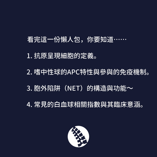 在激烈駁火的戰場上,立下最多功勞的也許是在後方運籌帷幄的軍師,也有可能是戰無不勝、叱吒風雲的將軍。但是最不可或缺的還是那和敵人短兵相接的步兵了吧!在人體的免疫系統中,擔任步兵角色的正是我們熟悉的嗜中性白血球(本文以下簡稱嗜中性球),他們也被多數課本描述為「數量最多的白血球,以吞噬能力清除病原體」。看起來很普通嗎?但你可知道它也有強大的傳令能力?還可以佈下天羅地網捕捉病原體?本期懶人包就要介紹高中課本沒有描繪的嗜中性球的特殊能力!